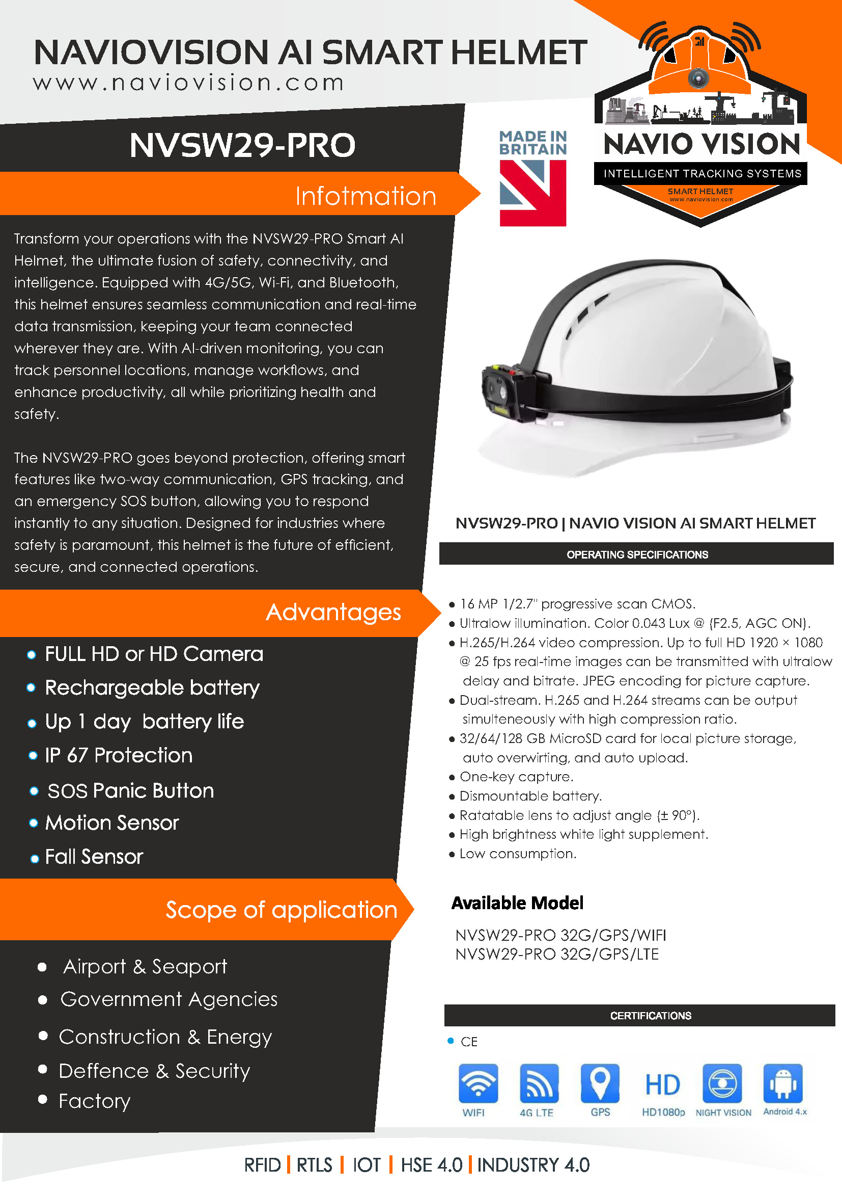 The NVSW29 PRO goes beyond protection, offering smart features like two-way communication, GPS tracking, and an emergency SOS button, allowing you to respond instantly to any situation. Designed for industries where safety is paramount, this helmet is the future of effcient, secure, and connected operations.